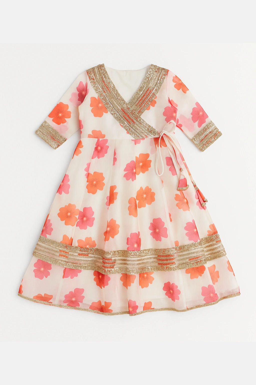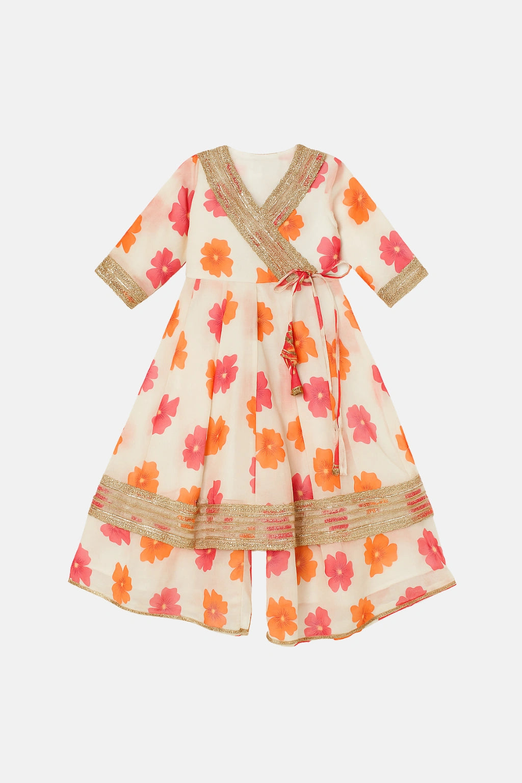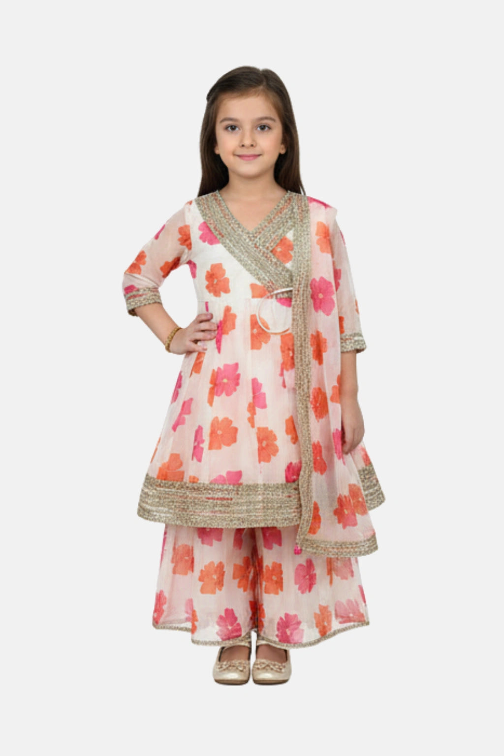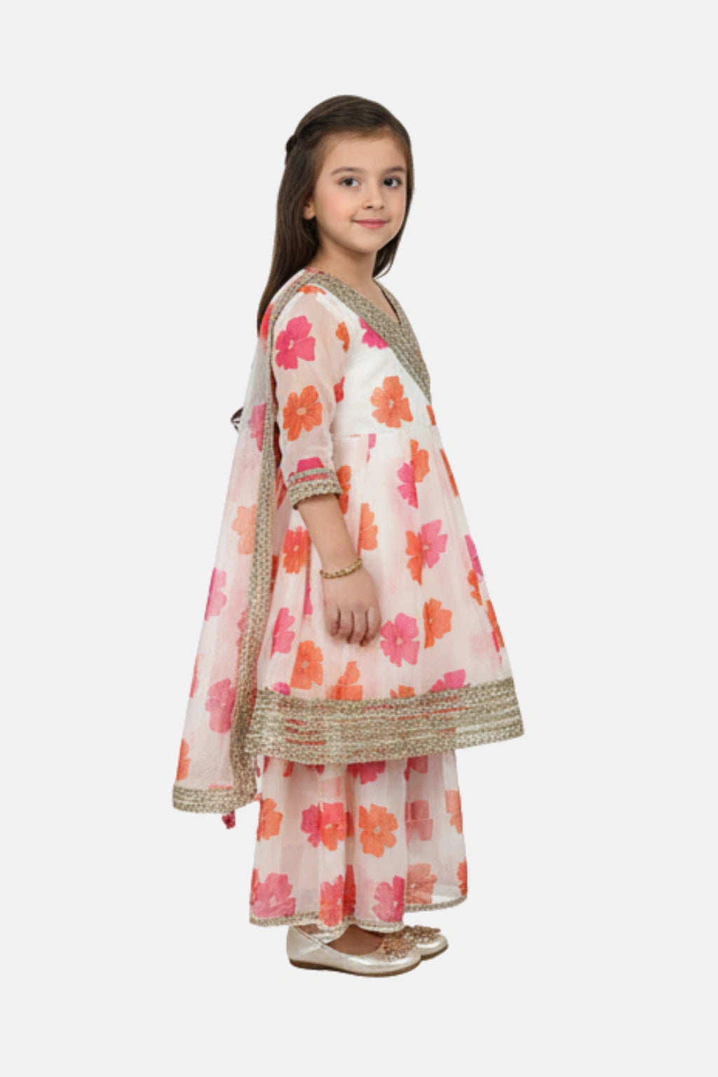 A beautiful organza sharara set designed for festive comfort and elegance. Featuring a floral printed Anarkali kurta with Angrakha styling, paired with a soft organza sharara and a lightweight chiffon dupatta—perfect for celebrations, weddings, and special occasions.